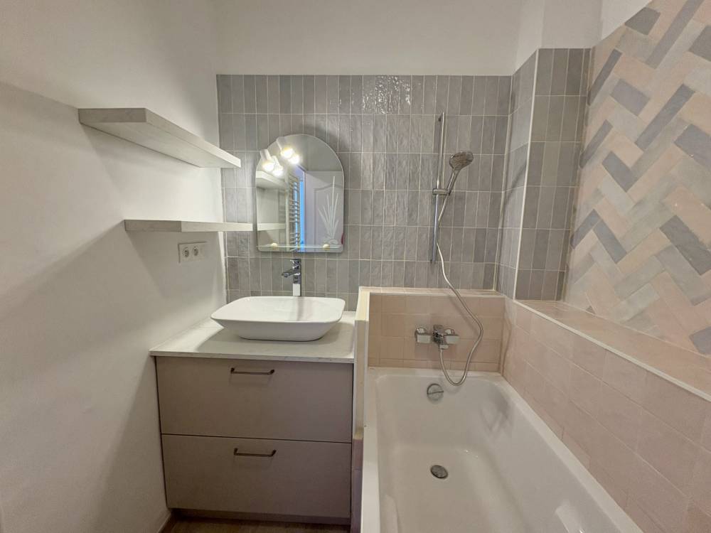 - Des zelliges carrés aux reflets vibrants, qui habillent les bâtis et le bas de la baignoire.